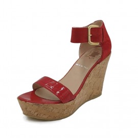 Der vordere Teil besteht aus rotem Lackleder, der hintere Teil der Sandalette ist aus rotem Glattleder mit goldiger Schnalle.